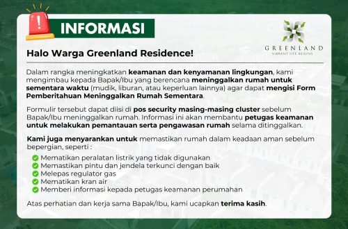 Salam hangat kepada Yth. Bapak/Ibu penghuni perumahan Greenland Residence. Kami menginformasikan untuk layanan pengadu.....
